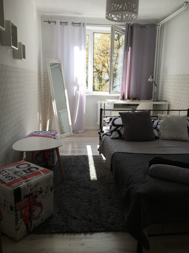 Le logement est un appartement dans le centre de Varsovie qui est géré par un couple de voyageurs qui n’habitent pas sur place. Attention : la ville étant spatialement étendue, nous avions l’impression sur les cartes d’être très proches du centre, alors que nous devions prendre le tram (arrêt de tram à 3 minutes à pieds) pour aller à la vieille ville (trajet de 15 minutes). Le tram (ou le bus) était nécessaire pour se rendre à tous les lieux d’intérêt, à quelques exceptions. Nous étions cependant à 15-20 minutes à pied de la gare, ce qui était très pratique. La cuisine, deux salles de bain et deux toilettes (avec machine à laver) sont communes avec trois ou quatre autres chambres. La chambre est privée et était vraiment bien aménagée.